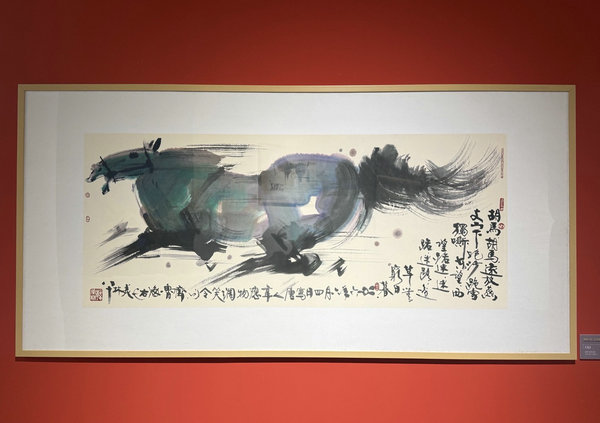 Among the highlights is Han's ink painting Horse, which stands out for its bold, economical style. Using thick, forceful lines to define the horse's body and blocks of color for its form, Han achieves an effect that is both abstract and minimalist. Notably, the horse is depicted without hooves — suggested with a single stroke — giving the figure a sense of light movement.