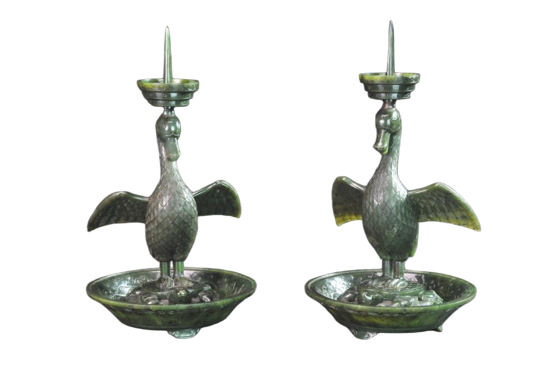 A pair of green jade candlesticks, Qing Dynasty (1644-1911), from the collection of the Wuhan Museum [Photo/Hebei Museum official WeChat account]