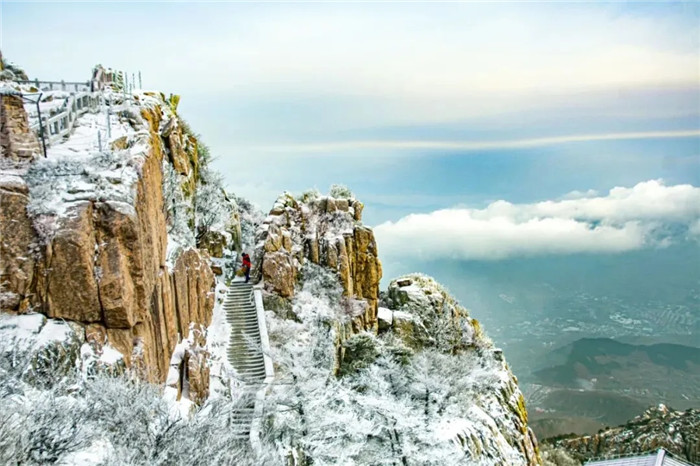 Stairs dusted with snow lead visitors through this frozen fairy tale on Taishan Mountain. [Photo/WeChat account: SDTXTA]