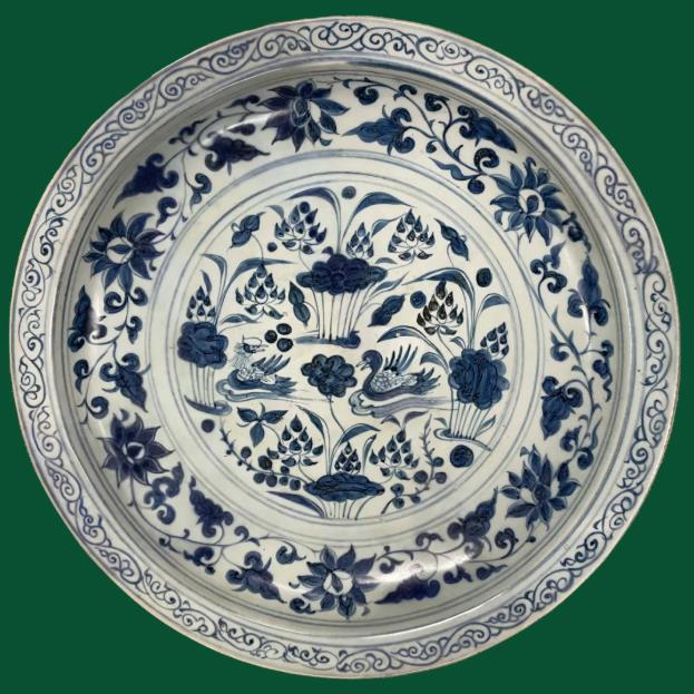 Blue-and-white plate with mandarin duck and lotus flower motifs, Yuan Dynasty (1271-1368), from the collection of the Nanjing Museum [Photo/Museum of Wu official WeChat account]