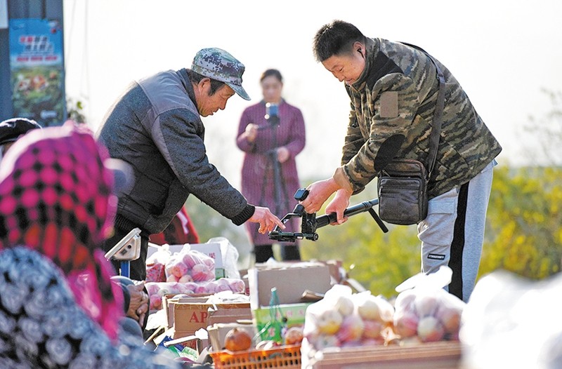 Livestreamers introduce local apples from the Zhuquan apple market in Zhongzhuang township, Zibo city, Shandong province, on Nov 9. [Photo provided by Zhao Dongshan/You Kuikui/For China Daily]