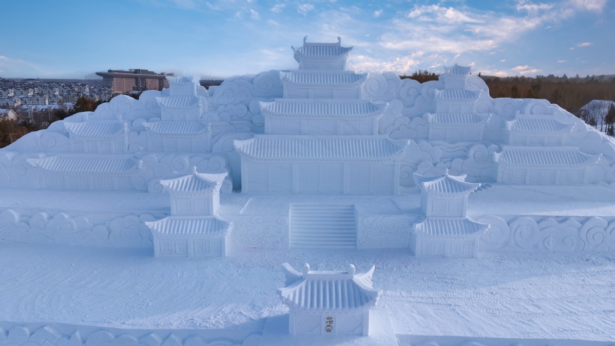 A large-scale snow sculpture of a palace floating in the sky is recently completed in the Changbai Mountain scenic area in Jilin province. [Photo provided to chinadaily.com.cn]