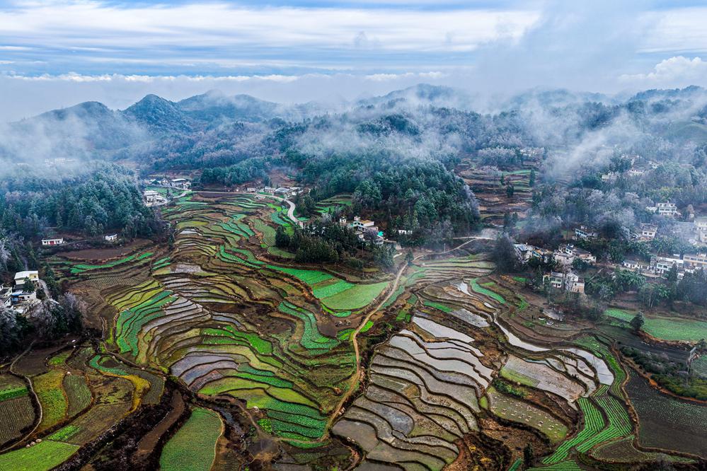 An aerial view of the terraced fields in Qianxi, Guizhou province, cloaked in white rime. [Photo by Wu Chuanjuan/For chinadaily.com.cn]