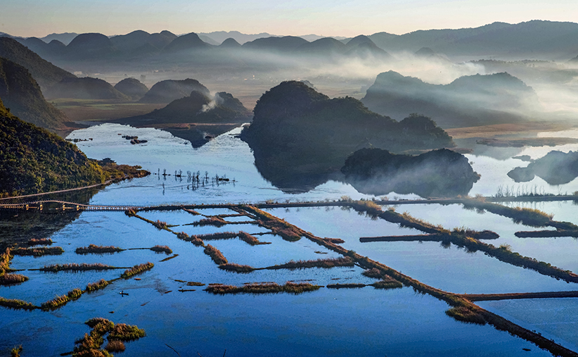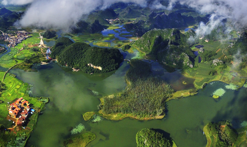 "Puzhehei" is the language of the ethnic Yi people, which means a lake full of fish and shrimps. Covering a total area of 388 square kilometers, the Puzhehei Scenic Area in Southwest China’s Yunnan province belongs to the karst area in southeastern Yunnan and is a typical mature plateau karst landform. It is also a national-level scenic spot, a national 5A-level tourist attraction, and a national wetland park.