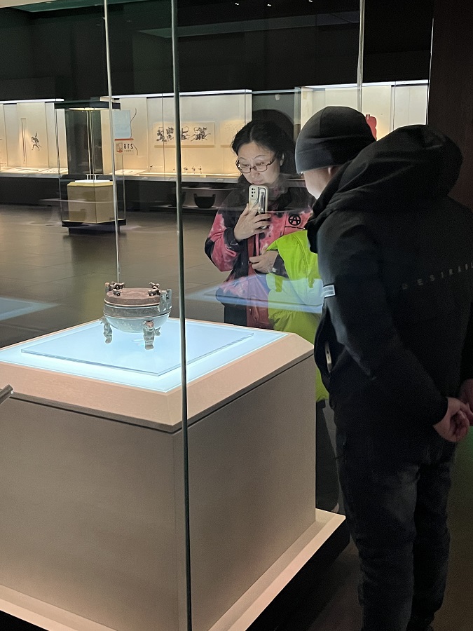 Visitors observe the Tripod with Bear-Shaped Feet on display at the Hebei Museum in Shijiazhuang, Hebei province. [Photo by Zhao Rixi/For chinadaily.com.cn]