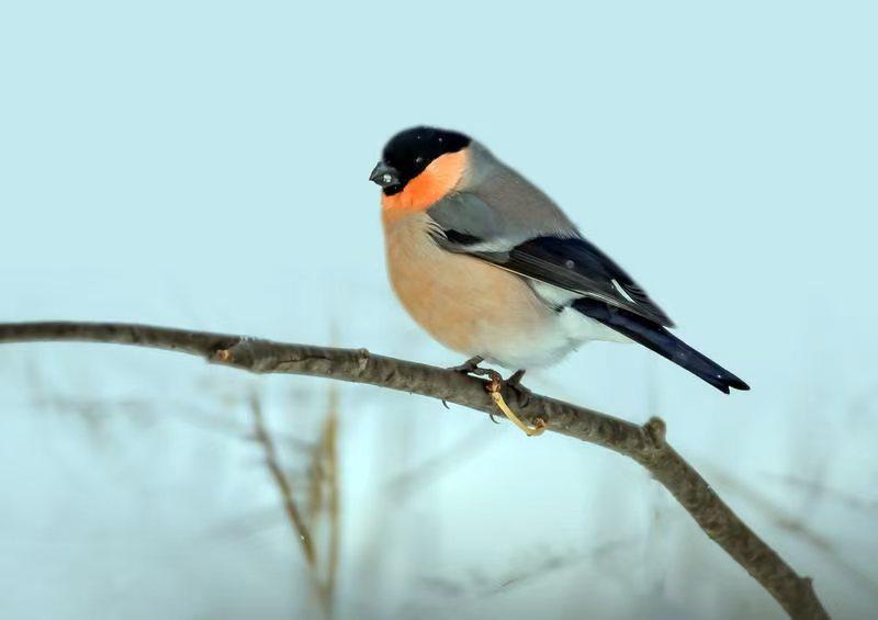 A red-breasted gray finch perches on a tree in Qianpailou village in Panshi city, Jilin province. [Photo by Jinlin Daily/For chinadaily.com.cn]