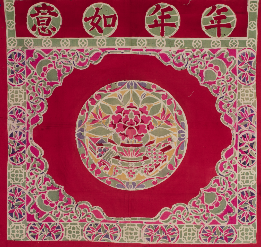 Colored table skirt decorated with four Chinese characters meaning "annual fulfillment" ( niannian ruyi), produced in Anyang, Henan province, from the collection of the Tsinghua University Art Museum [Photo/Tsinghua University Art Museum official WeChat account]