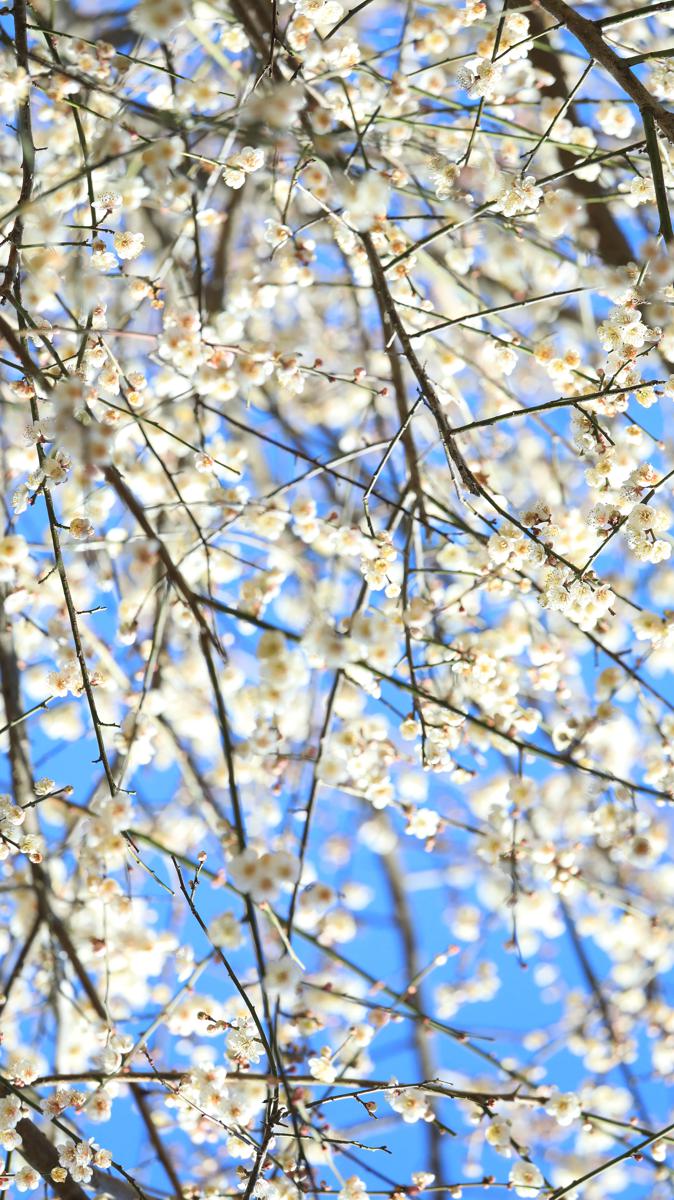 Petals shimmer in the sunlight as soft yellow stamens scatter forward. The white plum blossoms blend seamlessly with the well-arranged village cottages, set against a backdrop of clear, azure skies.