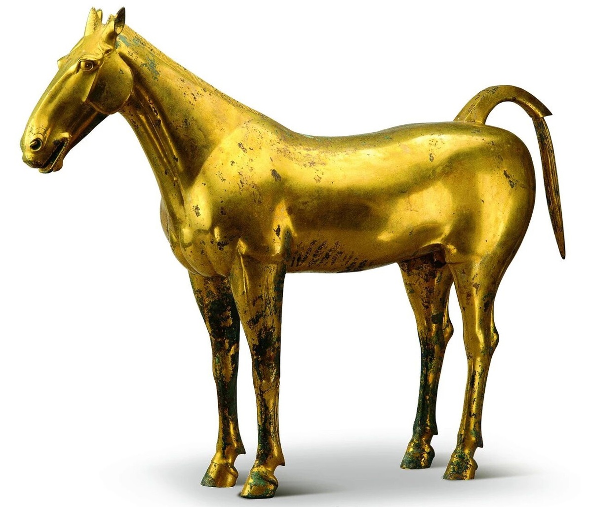 Discovered in 1981, this gilded bronze horse, modeled after the Ferghana horse, also known as the "blood-sweating horse", was unearthed from a tomb in Emperor Wu's Maoling Mausoleum. Standing calmly yet powerfully, it features a chest with taut muscles and sharply defined hooves – solid and strong, embodying the might of the Han Empire and reflecting the highly developed horse culture of the Han Dynasty. Collection: Maoling Museum, Xianyang, Shaanxi.