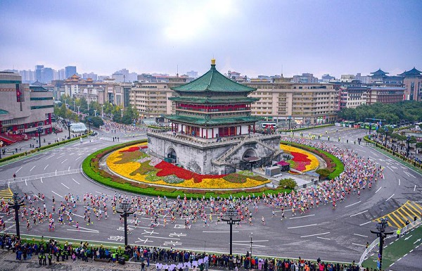 The Xi'an Marathon course connected the city's development from the Qin (221-206 BC), Han (206 BC-AD 220), and Tang (618-907) dynasties to the modern era, with city landmarks, including the Xi'an City Wall, the Bell Tower, and the Daming Palace National Heritage Park, enabling participants to run through ancient and modern times.