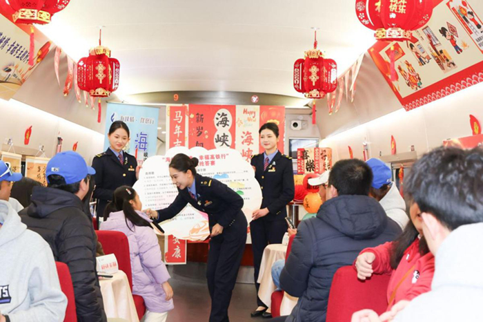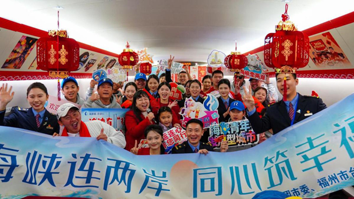 A specialized "Cross-Strait Harmony" (G1674) high-speed train officially departed on Feb 3, serving as a mobile platform for cross-Strait cultural exchange during the Chinese New Year rush. Traveling through major hubs like Fuzhou, Shanghai, Hangzhou, Xiamen, and Wenzhou, the initiative aims to help turn Fuzhou into a top destination for Taiwan residents and enterprises seeking integrated development in Fujian province.