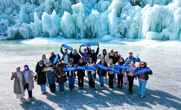 Expats pose for group photos in front of the spectacular ice waterfall at Jiuru Mountain. [Photo provided to chinadaily.com.cn]