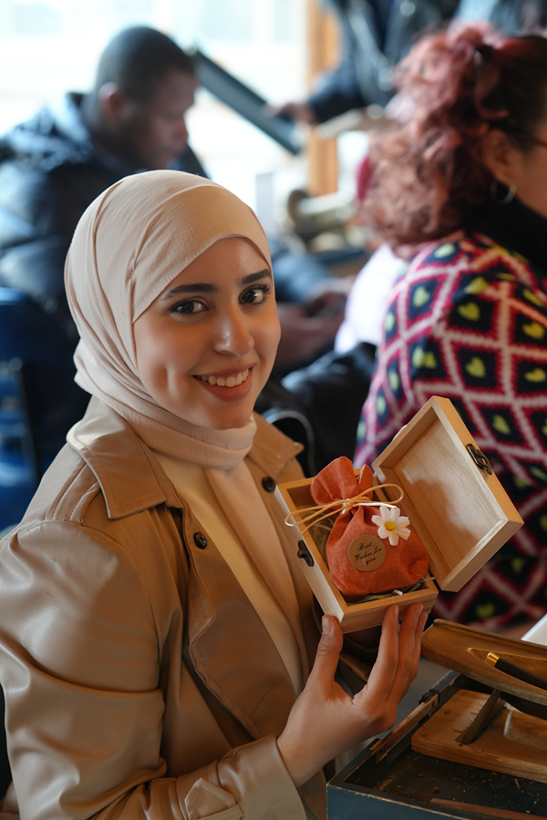 An expat displays a handmade sachet, experiencing traditional Chinese handicrafts firsthand. [Photo provided to chinadaily.com.cn]