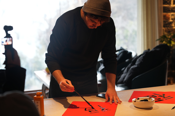 A visitor tries his hand at writing the Chinese character fu, meaning good fortune, to welcome Spring Festival. [Photo provided to chinadaily.com.cn]
