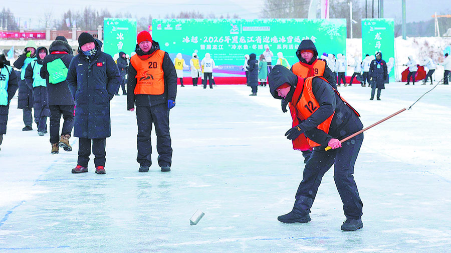 The Mishan event features snow soccer, speed skating, snow tug-ofwar, and a fun curling competition, with six teams from the cities of Mishan, Hulin, Suifenhe, Muling, Dongning, and Jidong county competing.