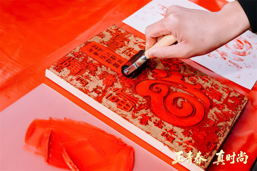 A visitor tries woodblock printing at the Taiwan Town in Pingtan county, Fujian province, Feb 10, 2026. [Photo provided to chinadaily.com.cn]