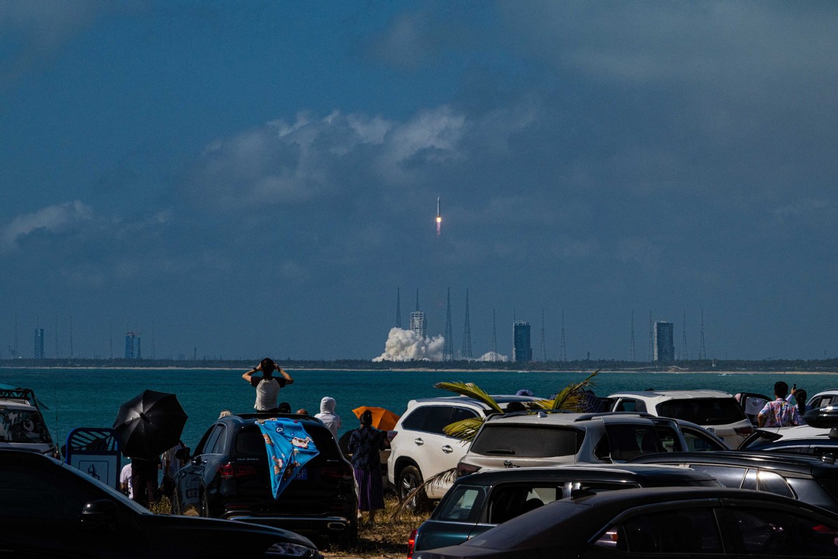 A prototype of the Mengzhou spacecraft was mounted atop a prototype first-stage booster of the Long March 10 heavy-lift rocket, which blasted off at 11 am from the Wenchang Space Launch Center, a coastal spaceport in Hainan province, and soon soared into the sky.