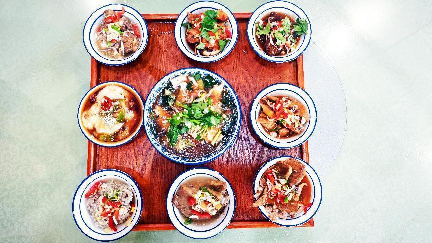 Nearby, an intangible cultural heritage food that includes nine dishes offers a more elaborate dining experience. Prepared through steaming, it features balanced meat and vegetable combinations, each with a distinct flavor.