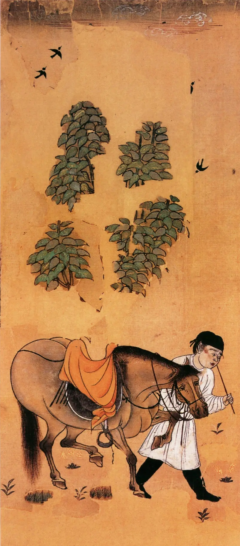 This painting, framed with purple silk and set within a wooden screen, depicts a saddled horse led by a groom holding a whip. With bold colors and vivid lines, the artist rendered the muscular horse of the Xiyu (Western Regions) standing powerfully, seemingly lost in thought.