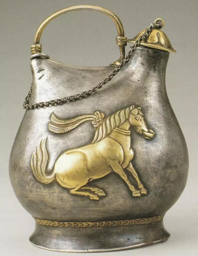 Dancing horses were a popular form of entertainment in the Tang Dynasty (618-907). On each side of this silver kettle, a gilded dancing horse is hammered in relief using a repoussé technique. The horse is strong and plump, captured in a moment of motion, with front hooves straight and firm, hind legs bent, and a wine cup grasped in its mouth. The spirited steed seems to embody the confidence and flourishing energy of the High Tang era. Collection: Shaanxi History Museum.