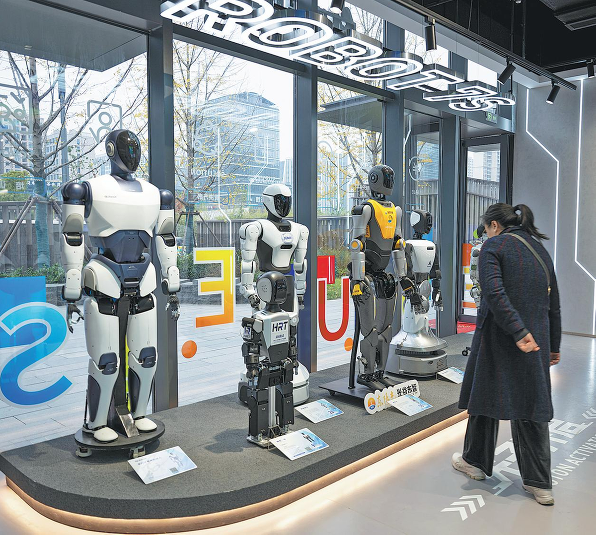 Inside the bustling store, robots of various sizes and shapes demonstrate their capabilities: some play soccer, others serve as retail assistants, while another group plays musical instruments.