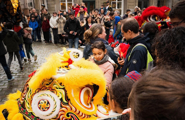 A vibrant dragon and lion dance draws large crowds in Rennes. [Photo/Sd China]