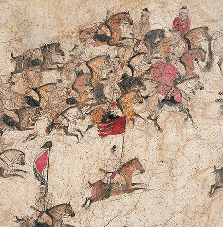 The mural features more than 40 mounted riders, two camels and five ancient trees set among rugged rocks. Hunters are armed with bows and arrows, some holding falcons, some carrying hounds, others leading trained cheetahs and lynxes. Every figure is delicately and vividly portrayed, offering precious insight into royal leisure of the High Tang period. Collection: Shaanxi History Museum.
