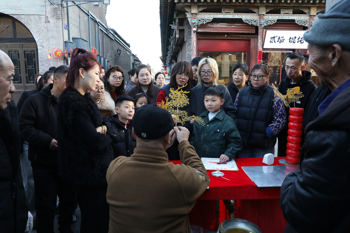 Visitors observe the craft of traditional sugar painting in Zhaoyu Ancient City in Qixian county, Shanxi province on Feb 19, 2026. [Photo by Wu Xiaohui/chinadaily.com.cn]