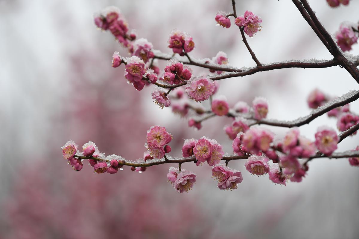 At Donghu Park, red plum blossoms embraced the snow, their radiant petals contrasting against the white branches.