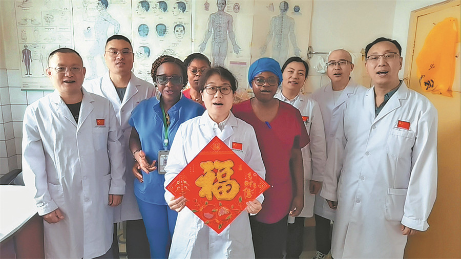 Members of the Shanxi medical aid team celebrate Chinese New Year with colleagues at a hospital in Yaounde, Cameroon. ZHANG LILI/FOR CHINA DAILY