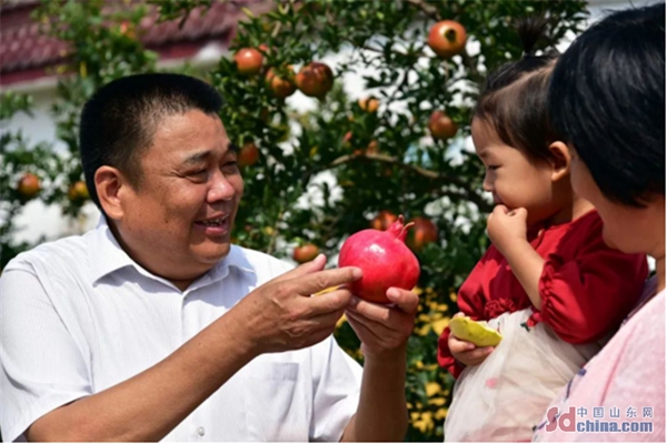 Zhang Dianzhuang, the Party chief of Beiyuantuan village in Qufu, shows a pomegranate to a girl. [Photo/SdChina]