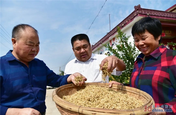 Zhang Dianzhuang chats with villagers in a field. [Photo/SdChina]