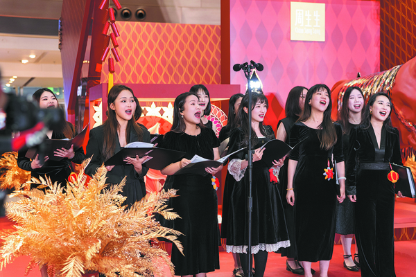 The Shanghai Rainbow Chamber Singers perform a mini concert under the baton of founding director Jin Chengzhi (bottom left) at a Spring Festival event at Grand Gateway 66 Plaza in Shanghai on Feb 4. [Photo/China Daily]