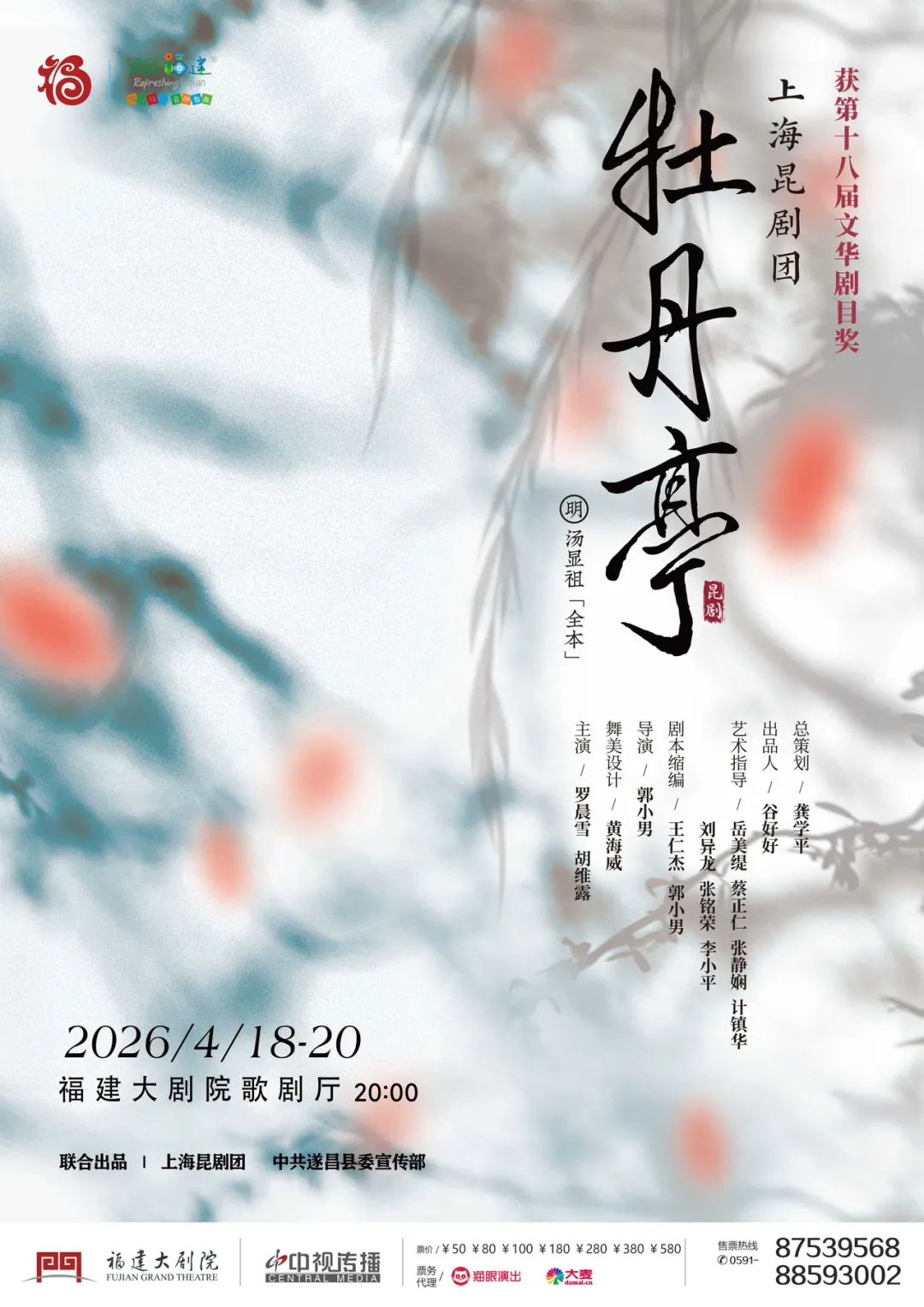 From April 18 to 20, the full 55-scene Kunqu Opera masterpiece The Peony Pavilion will be on stage at the Fujian Grand Theatre in Fuzhou. Presented by Shanghai Kunqu Opera Troupe, this contemporary interpretation preserves the poetic spirit of Tang Xianzu (1550-1616) while weaving a dual narrative of love and society. Witness the legendary romance of Du Liniang and Liu Mengmei unfold as a cultural epic of the Ming Dynasty (1368-1644).