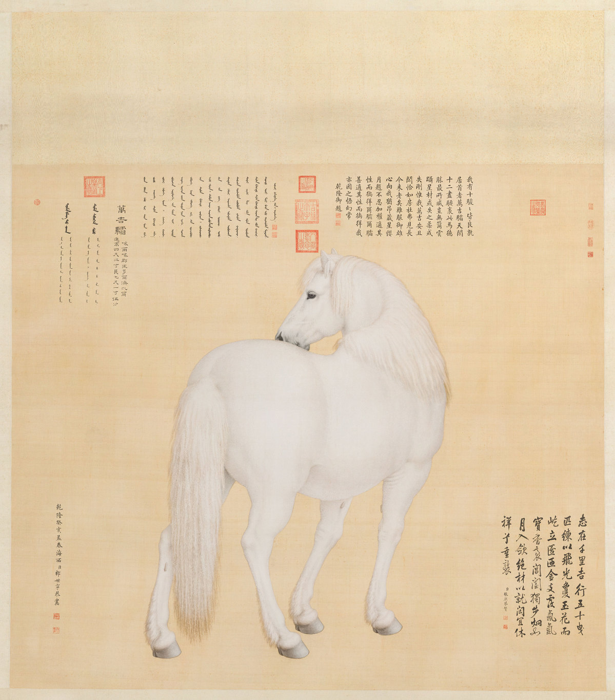 With delicate strokes, the artist Giuseppe Castiglione (Lang Shining, 1688-1766) masterfully renders the horse's expression and the soft texture of its coat. Subtle highlights and shading bring the powerful muscles to life, giving the animal a vivid sense of strength and vitality. Collection: Palace Museum.