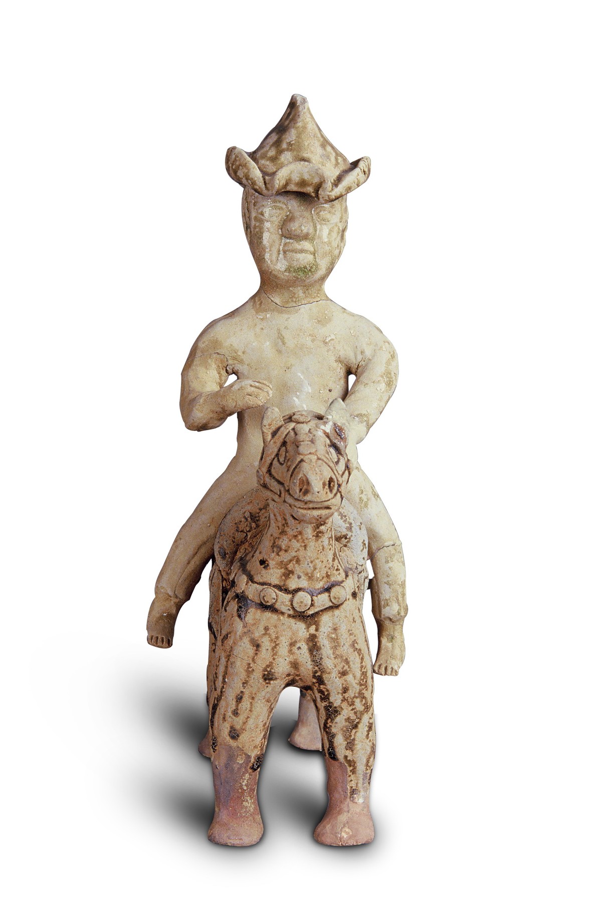 An "equestrian sport show" from the Three Kingdoms (220-280) era is captured in this celadon figurine on a horse. The horse stands alert with ears pricked and head held high, full of lively charm, while the rider wears a pointed hat with a turned-up brim, hands poised to whip the horse into a gallop.