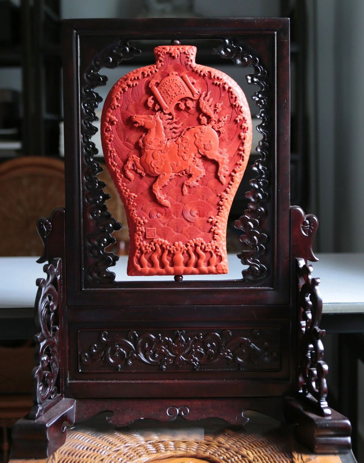 Carved red lacquer screen with motifs of a dragon horse presenting a painting scroll, Wen Qiangang, 2025 [Photo/National Art Museum of China official WeChat account]