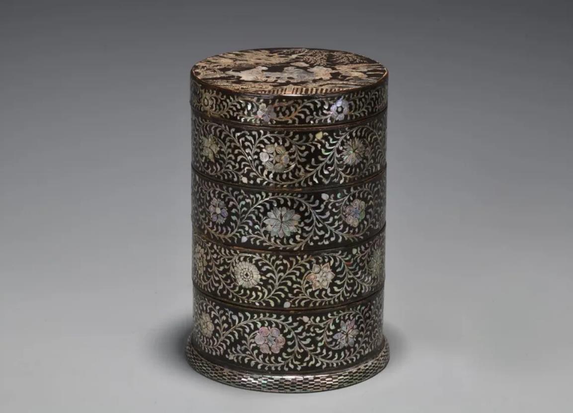 On the lid, two elders sit in a quiet conversation in a bamboo grove. Their robes and expressions are rendered with remarkable precision. Encircling the box, intricate floral scrolls "bloom" in vibrant hues, showcasing the extraordinary craftsmanship of mother-of-pearl inlay at its finest. Housed in the Zhejiang Provincial Museum, this piece is a testament to the elegance and artistry of Ming lacquerware.