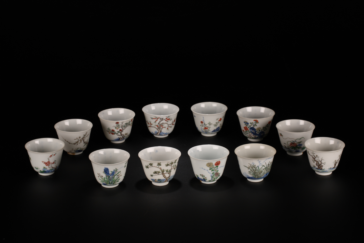 Blue-and-white wucai (five-color) cups with flower motifs in corresponding months, Qing Dynasty (1644-1911), from the collection of the Guangdong Museum [Photo/provided to chinaservicesinfo.com]