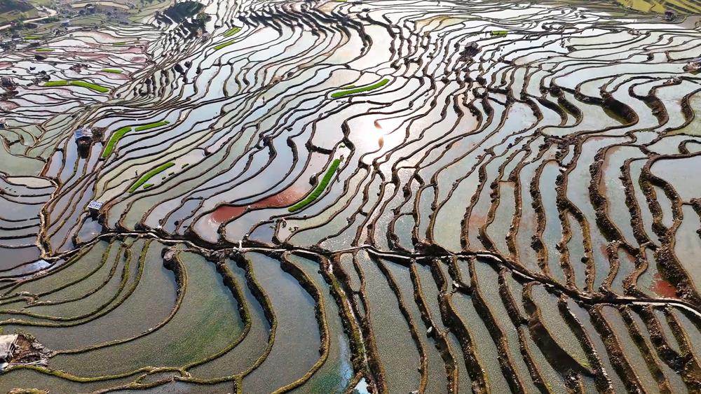 The Hani terraces in Lyuchun county, Honghe Hani and Yi autonomous prefecture, Yunnan province, have entered their peak spring plowing season, with the layered fields turning a vivid green.