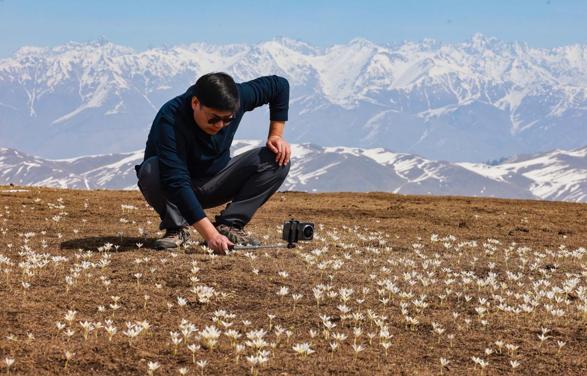 A visitor observes the white crocus blooms at the 2,000-meter-high meadows of the Narat grassland in Xinyuan county of Ili Kazak autonomous prefecture, Xinjiang Uygur autonomous region. [Photo by Zhang Wenting/For chinadaily.com.cn]