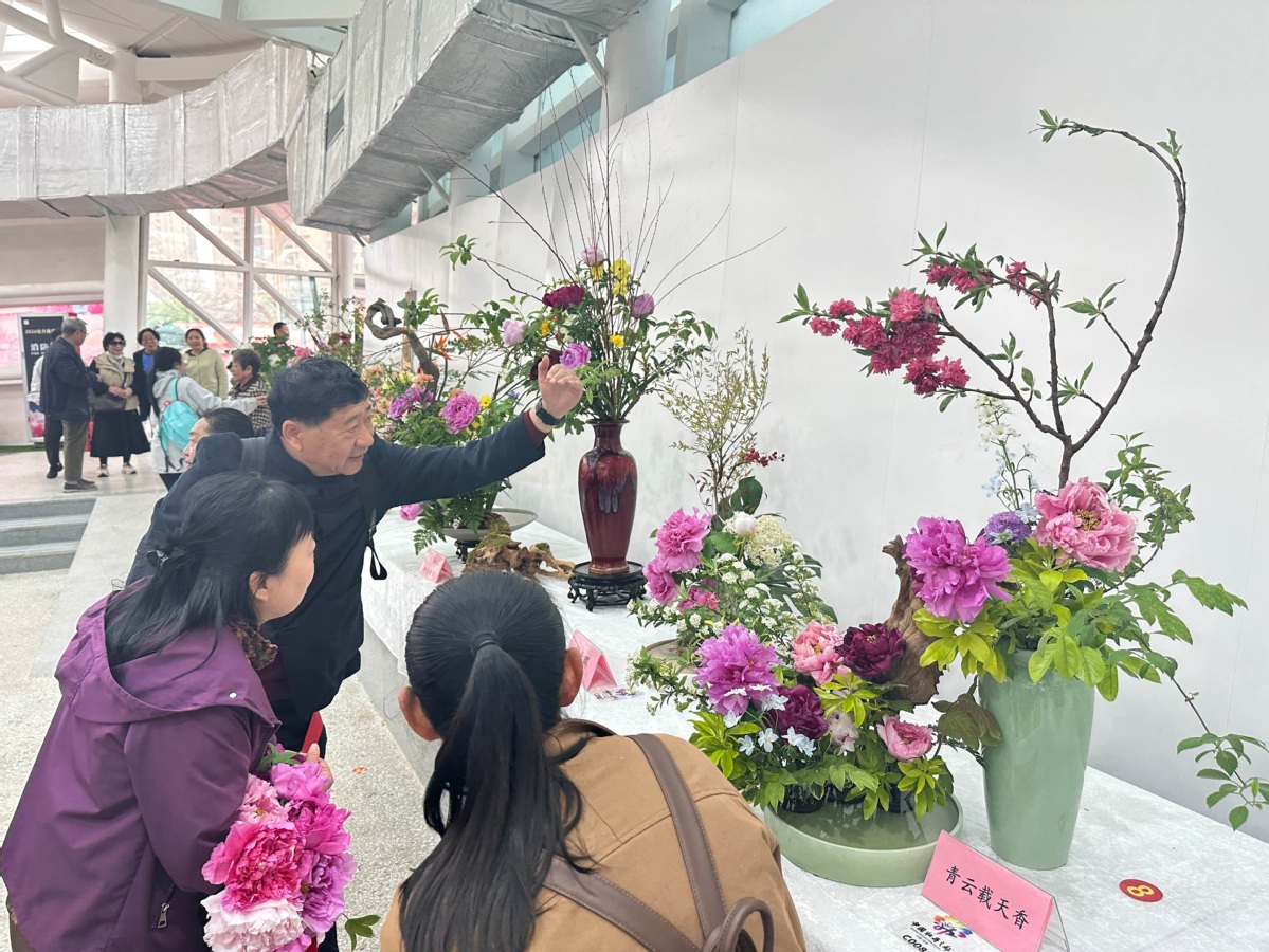 Visitors appreciate peony floral art pieces in Heze, Shandong province. [Photo by Zhao Ruixue/chinadaily.com.cn]