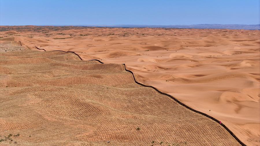 "We are reinforcing the windbreak and sand-blocking belt with a newly developed grass grid barrier. It is less labor-intensive than the traditional version, faster to install, and lasts longer -- five to six years," said Tang Ximing, a forestry engineer in Zhongwei, a city in Ningxia Hui autonomous region.