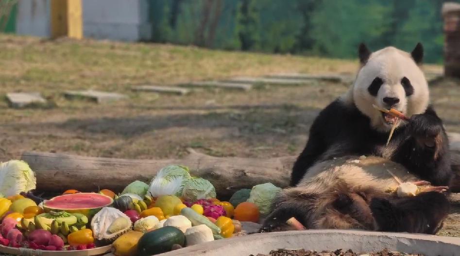 The panda pavilion was transformed into a banquet hall with a sumptuous array of delicacies, including bamboo shoots, watermelons, apples, carrots, pumpkins and bamboo leaves.